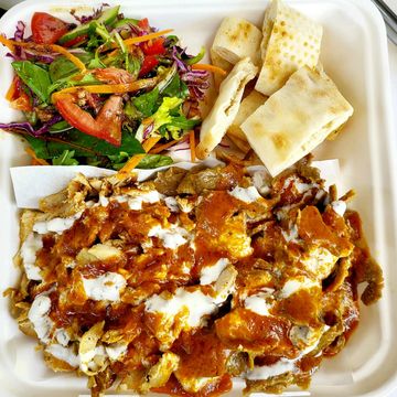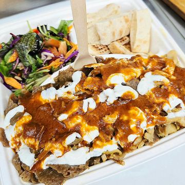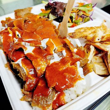 Mixed lamb & chicken doner on a bed of Turkish rice (pilav), top with garlic yogurt sauce, special Iskender sauce, salad, fresh baked Turkish bread